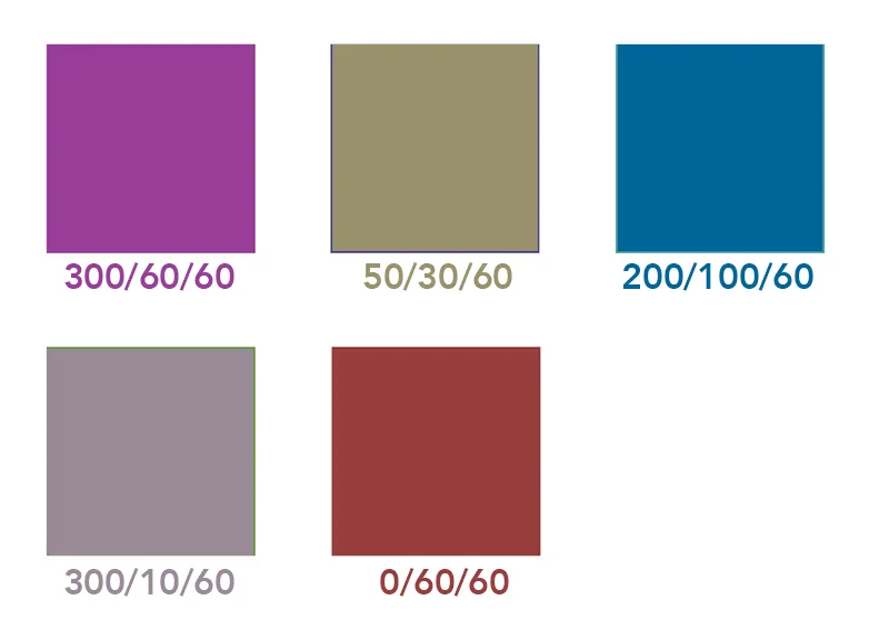Se vari il solo valore “H” otterrai una tavolozza come quella sotto. Se vari “H” e uno dei valori tra “S” e “B” otterrai un’emozione diversa, vedi il secondo esempio. È sufficiente tenere costante uno o due dei valori H, S e B.