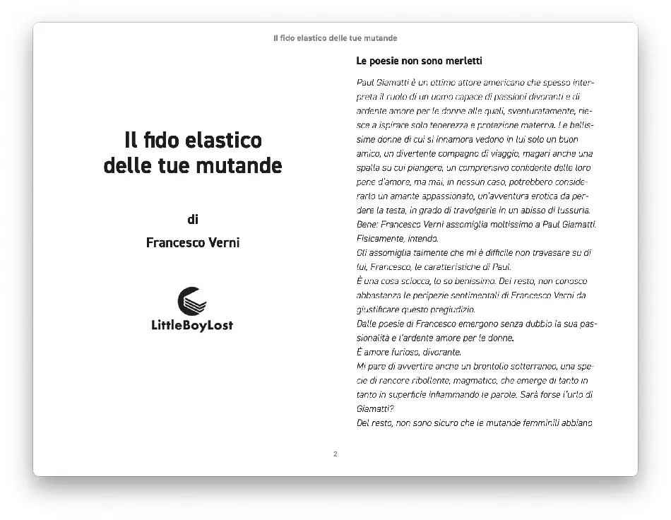 L’incarico consisteva nel progetto grafico e impaginazione di un libro e della sua copertina, per la stampa e il formato Epub3 reflowable. In base all’indirizzo fornito dal cliente sono state fatte alcune pagine esempio con caratteri e gabbia diversi per interno e copertina.