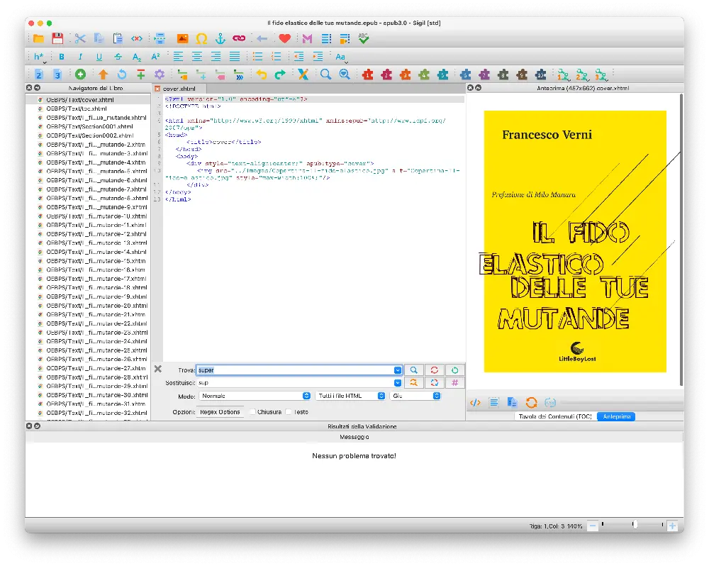 L’incarico consisteva nel progetto grafico e impaginazione di un libro e della sua copertina, per la stampa e il formato Epub3 reflowable. In base all’indirizzo fornito dal cliente sono state fatte alcune pagine esempio con caratteri e gabbia diversi per interno e copertina.