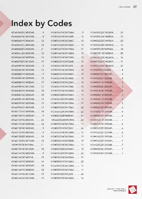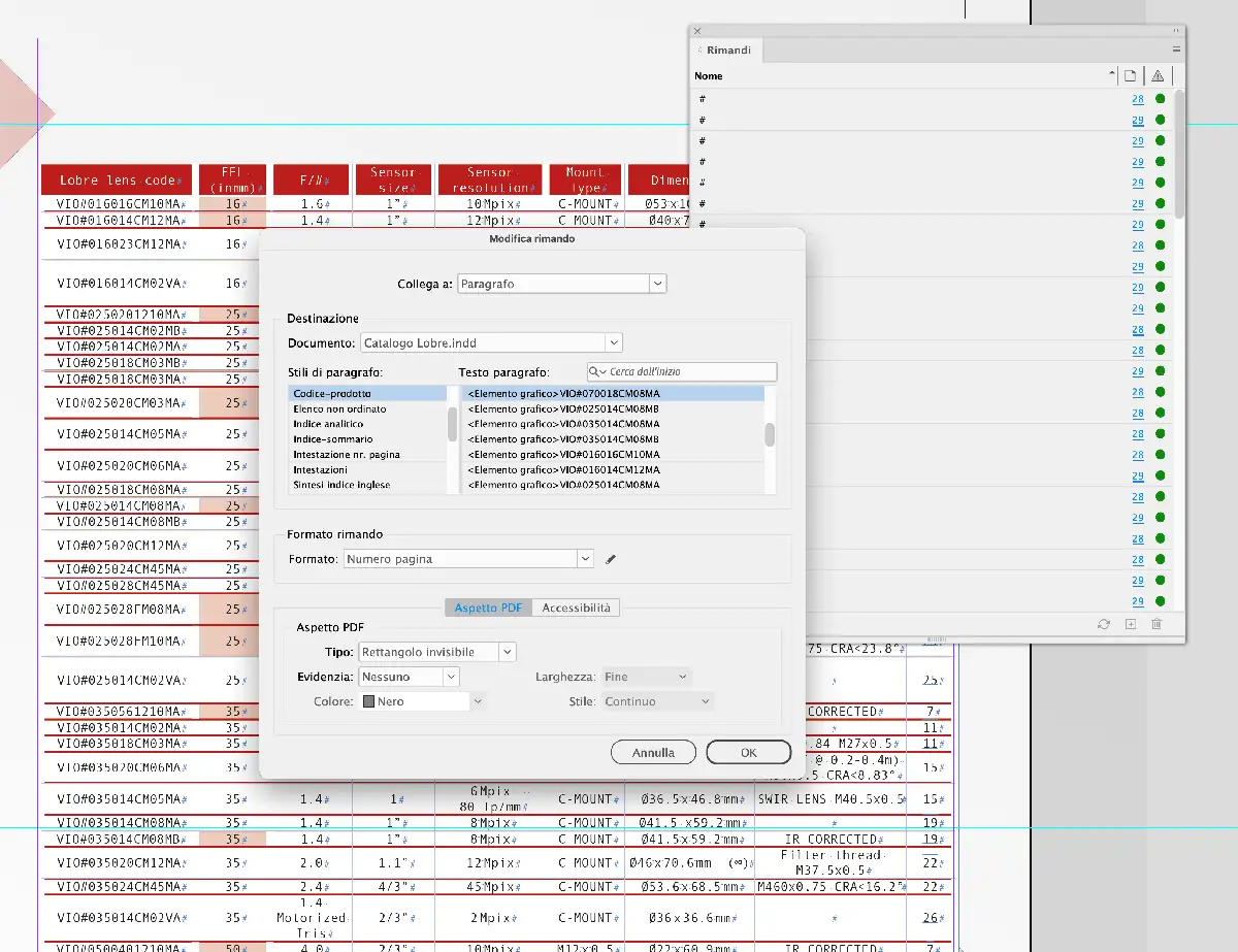 Il catalogo ha 2 indici, anch’essi dinamicamente collegati ai rispettivi prodotti/sezioni nel Pdf versione schermo. Oltre al principale “table of contents” ho proposto al cliente un indice in ordine di codice. L’indice è un aspetto tecnico importante