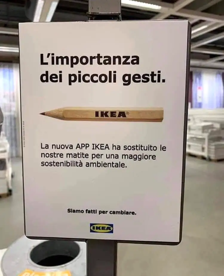 Certo, sostituire le matite con le app non risolverà il riscaldamento globale. Non è questo il punto. Il punto è che si vede il tentativo di promuovere lo scopo aziendale. Spesso le aziende definiscono uno scopo come da manuale e poi lo descrivono nel company profile e la cosa finisce lì. Così non serve a molto. Sarebbe invece un esercizio interessante, anche per una piccola e piccolissima impresa, definire uno scopo oltre che una missione e poi adeguare ad esso la comunicazione futura. Questa segnaletica ha detto alle persone che possono usare l’app invece della matita, questa è la messaggio del cartello, la sua missione è perseguire lo scopo aziendale. Come minimo questa strategia è capace di rendere il messaggio più interessante e calamitare un po’ di attenzione in più.